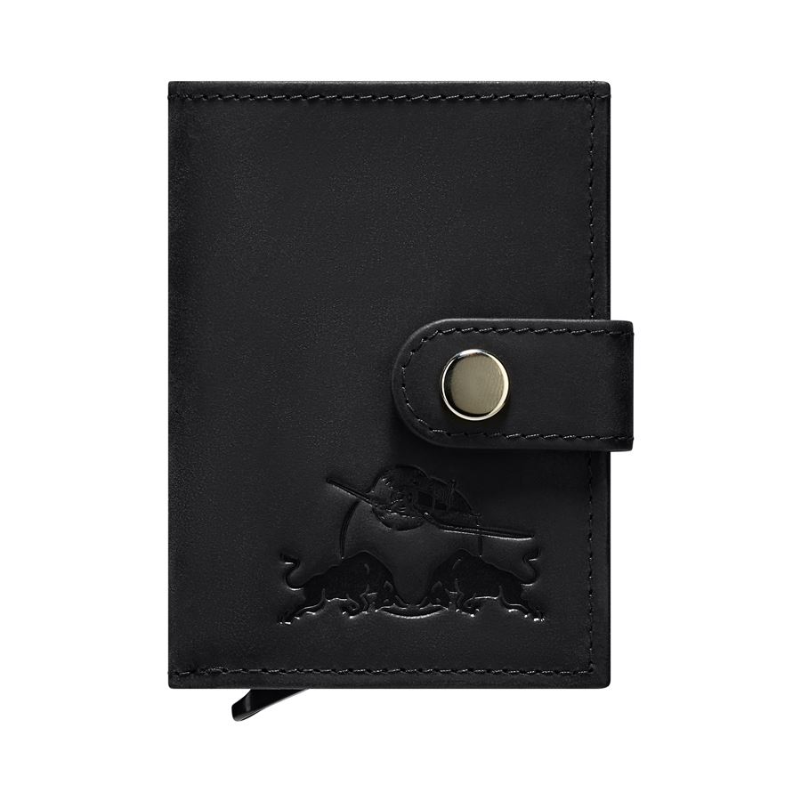Travel light with this classic leather card holder featuring a debossed Flying Bulls logo on the front for a stylish minimalist look, with a strap closure to keep your cards secure.