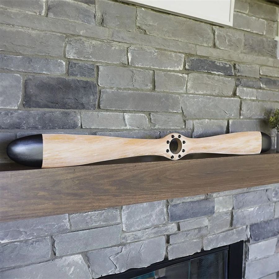 Distressed Wooden Display Propeller is hand-crafted of wood and features hand-painted black tips accompanied by a distress finish, replicating wooden propellers from the early days of aviation. Features: LightweightHand-crafted from solid woodDistressed finishBlack tipsKeyhole hanger for easy displayMeasures:ca 119 cm x 10 cm