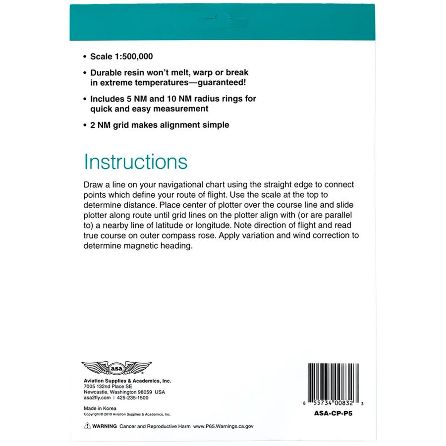 Zjednodušte si plánování letu s tímto praktickým a snadno použitelným plotterem.Plotter CP-P5 je vyroben z odolné pryskyřice, takže se v extrémních teplotách neroztaví, nedeformuje ani nepraskne. Díky kompaktní velikosti 13 × 13 cm a jednoduchému použití je oblíbeným nástrojem pilotů pro přesné a rychlé plánování letu. Používá měřítko 1:500 000 a obsahuje kružnice o poloměru 5 NM a 10 NM pro snadné měření. Mřížka po 2 NM usnadňuje zarovnání s rovnoběžkami. Navíc má doživotní záruku.Rozměry: 33 × 13 cm