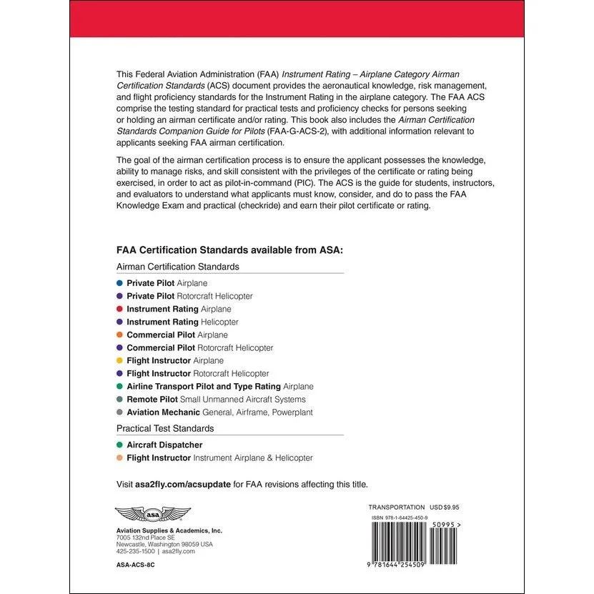 This Federal Aviation Administration (FAA) Instrument Rating Airplane Airman Certification Standards (ACS-8C) supersedes the previous edition (ACS-8B), and is the guide for students, instructors, and evaluators to understand what applicants must know, do, and consider to pass their FAA Knowledge Exam and practical (checkride) and earn their instrument rating in the airplane category, single-engine land and sea, as well as multi-engine land and sea classes (ASEL, ASES, AMEL, AMES). This ACS includes the aeronautical knowledge, risk management, and flight proficiency standards necessary for certification, ACS codes, and the Companion Guide (FAA-G-ACS-2).