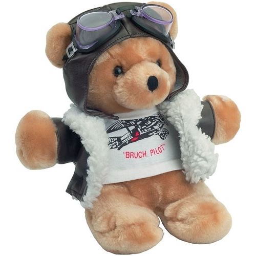 Cuddly textile bear, dressed as pilot with T-Shirt "Bruch Pilot", pilot jacket, goggles and cap.